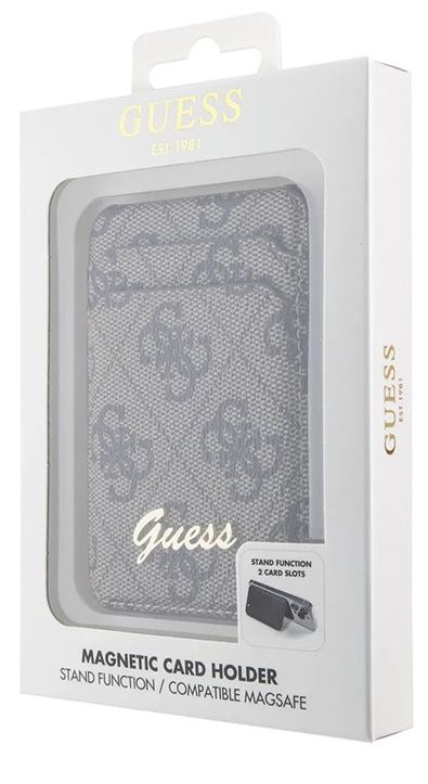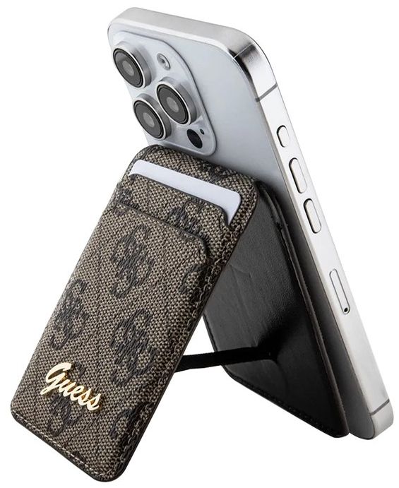 Бумажник Guess с технологией крепления Apple Magsafe. Инновационное решение позволяет легко и надежно присоединить аксессуар к задней панели вашего смартфона или установить на защитный чехол, который поставляется с магнитным кольцом MagSafe. Изготовлен из искусственной кожи, декорирован монограммой бренда и металлическим логотипом Script metal logo. Имеет два отделения для хранения пластиковых карт. Может выполнять функцию подставки для просмотра видео или чтения книг.