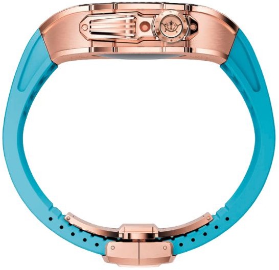 Материал Корпус изготовлен из часовой нержавеющей стали 316L с золотым PVD-покрытием Rose Gold. Декор Верхняя часть корпуса инкрустирована декоративными болтиками из легированной стали с высоким содержанием хрома с золотым PVD-покрытием Rose Gold и украшен кристаллами Swarovski (россыпь из 224 камней). Ремешок Фактурный каучуковый ремешок светло-синего цвета c двойной застежкой. Лимитированная серия 999 экземпляров.