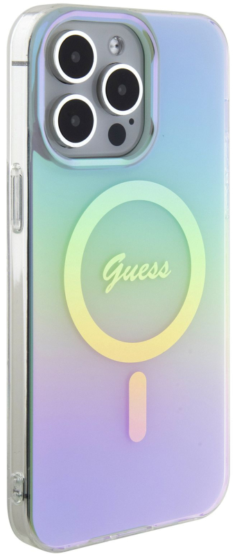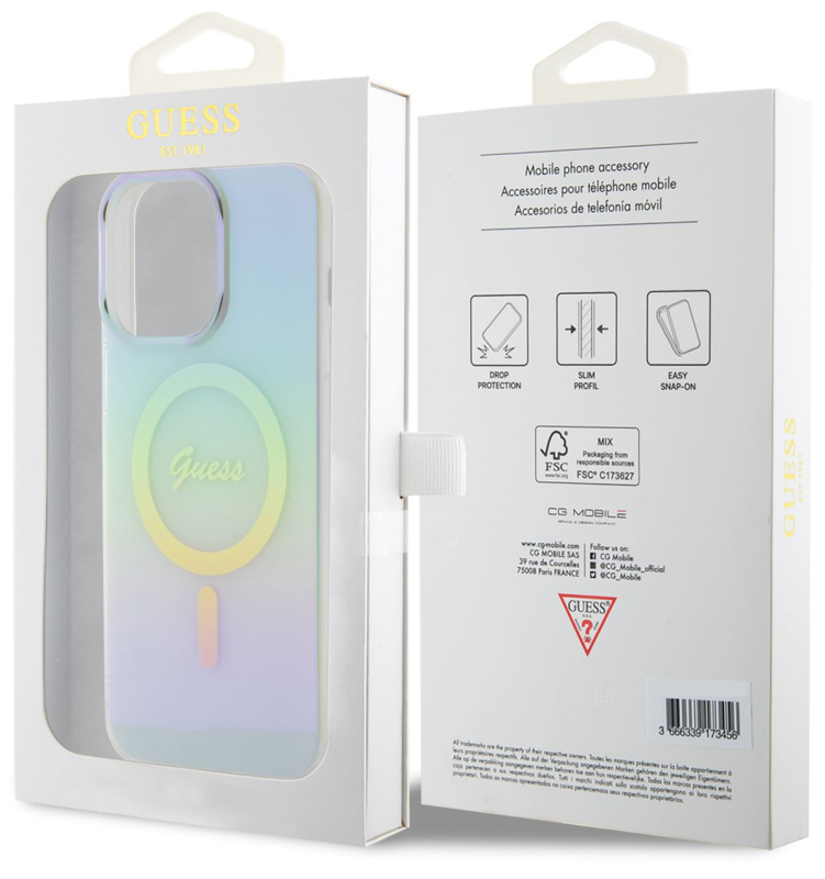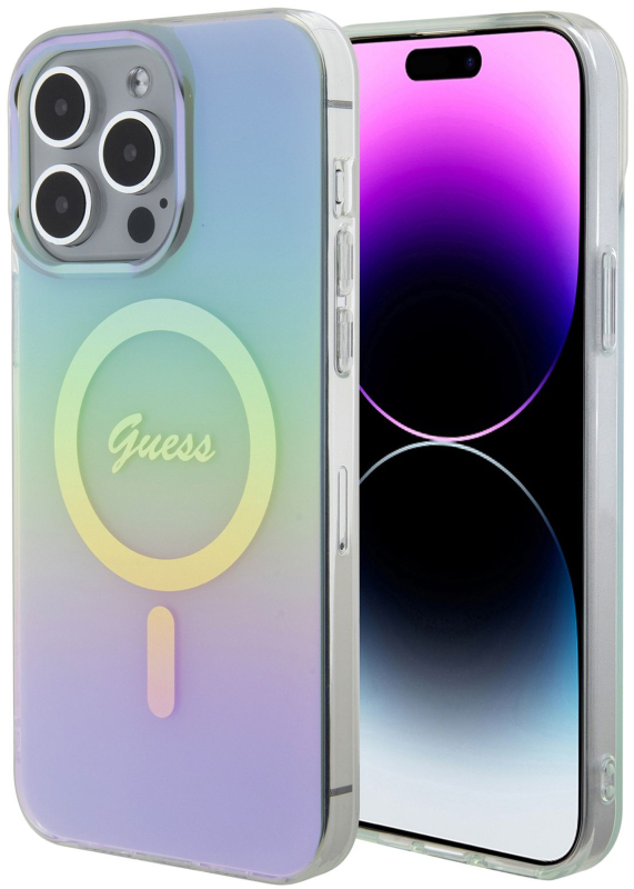 Чехол бренда Guess со встроенными магнитами Magsafe обеспечит надежную защиту вашего Apple iPhone 15 серии. Изделие изготовлено из прочной пластиковой основы и силиконового бампера. Внешняя поверхность чехла декорирована контрастной разметкой Magsafe и переливающимся градиентом. Изделие плотно облегает корпус телефона, а его конструкция отлично защищает устройство от повреждений, царапин и сколов, которые неизбежны в процессе ежедневной эксплуатации. Высокие бортики вокруг камеры и экрана оберегают устройство от механических дефектов. Все отверстия для разъемов, динамика и камеры выполнены точно и аккуратно, а боковые клавиши защищены заглушками, интегрированными в чехол – это защищает их от попадания грязи, пыли и воды. На боковой части чехла расположены два отверстия для крепления шнурка или подвески. Чехол легко очищается от загрязнений, не препятствует сигналам NFC и сохраняет удобство использования с устройством Magsafe. Поставляется в оригинальной подарочной упаковке.