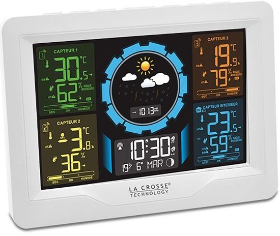La Crosse WS6304 – это мультизонный измерительный комплекс, сочетающий в себе классический функционал метеостанции и возможность одновременного контроля температуры и влажности в 4 точках, удаленных на расстояние до 60 метров от базы. На ярком дисплее в удобном для восприятия формате выводится информация от трех независимых датчиков (датчики с собственным дисплеем идут в комплекте) и встроенного в базу сенсора. У большинстве похожих моделей подобный функционал сильно ограничивает остальные возможности станции, но инженеры La Crosse Technology смогли сделать настоящий универсальный комплекс! Помимо информации с термогигродатчиков, погодная станция La Crosse WS6304 покажет атмосферное давление и прогноз погоды на 12-24 часа. У нее есть календарь, время (может синхронизироваться по атомным часам), два будильника, индикация заморозков и условий появления плесени, фазы Луны, тенденции изменения параметров… Метеостанция сама будет следить за комфортом в ваших помещениях комнате и подаст звуковой сигнал, если температура и влажность выйдут за границы выбранного вами диапазона. Этот гаджет – одно из самых функциональных и полезных устройством для комфортной жизни, ведь “из коробки” вы получаете возможность контроля микроклимата в 4-х зонах одновременно, – при этом La Crosse WS6304 не лишает вас других важных возможностей, присущих приборам этого класса. Просто поместите беспроводные датчики туда, где важны температура и влажность и наслаждайтесь новым уровнем контроля! Это может быть улица, детская комната, теплица, винный погреб, или морозильная камера, – станция без проблем измерит и покажет значения на дисплее, а также предупредит вас, если они превысят заданные вами значения. Кнопки управления четкие, понятные и расположены в удобном месте на верхнем торце погодной станции. La Crosse WS6304 создан для того, чтобы быть нужным и полезным для вашей комфортной жизни!