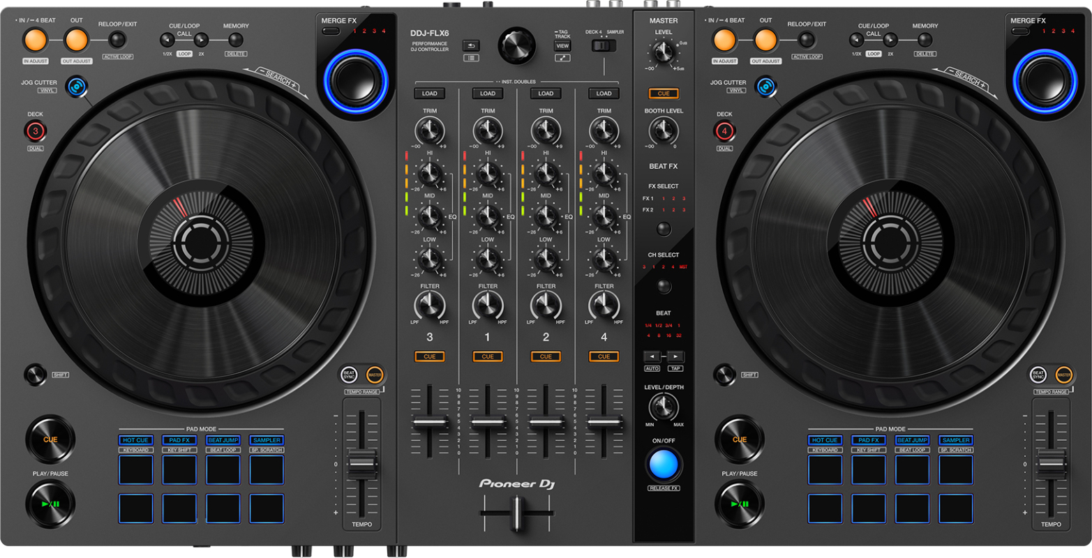 Микшерный пульт Pioneer DDJ-FLX6-GT Продвинутый 4-канальный контроллер для диджеев, который работает с большинством популярных приложений для сведения треков Взаимодействует с самым разным софтом Бесплатные лицензии для rekordbox и Serato DJ Pro уже входят в комплект поставки микшерного пульта. Более того, обновлённый Pioneer DDJ-FLX6-GT получится использовать с популярным приложением VirtualDJ. Также возможно взаимодействие с Traktor Pro 3, для чего важно загрузить дополнительные файлы настроек. Элементы размещены в привычных местах Благодаря переработанному матовому корпусу и увеличенным джогам графитового цвета дизайн Pioneer DDJ-FLX6-GT стал ещё более привлекательным. Расположение ключевых элементов повторяет привычное для опытных пользователей сочетание CDJ + DJM. Впрочем, модель будет интуитивно понятна и новичкам. Простое подключение к любым устройствам Важной особенностью микшерного пульта оказалась встроенная звуковая карта. Она даёт возможность подключать Pioneer DDJ-FLX6-GT к компьютерам и другим устройствам для использования rekordbox, Serato DJ Pro и другого программного обеспечения без какого-либо дополнительного оборудования. Более простое микширование разных стилей Микшерный пульт предлагает массу инструментов для сведения музыкальных композиций в рамках живого выступления. Pioneer DDJ-FLX6-GT расширяет этот набор специальными возможностями для взаимодействия с треками самых разных жанров вне зависимости от их скорости, а также тональности. Новый профессиональный эффект скретча При разработке нового микшерного пульта производитель уделил отдельное внимание эффектам скретча. Особенно интересна возможность Jog Cutter, которая позволяет добиться его профессионального уровня, просто перемещая джог-колесо к последней отметке или текущей позиции воспроизведения. Удобные джоги реально большого размера Микшерный пульт разрабатывался для пользователей с самым разным уровнем подготовки. Pioneer DDJ-FLX6-GT окажется интуитивно понятным для новичков, но привычным для профессионалов. Последние точно оценят размер джогов устройства, которые точно такие же, как во флагманском плеере для диджеев CDJ-3000.