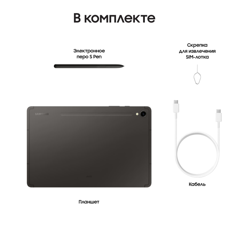 Яркий и чёткий экран Dynamic AMOLED 2x Большой, потрясающе яркий Dynamic AMOLED 2x экран с поддержкой HDR10+ и частотой 120 герц идеально подходит для работы и развлечений. Также дисплей стал безопаснее благодаря встроенному фильтру, понижающему уровень синего цвета. Две отличных камеры Фронтальная камера с разрешением 13 мегапикселей обеспечивают превосходное качество селфи-снимков и видеосвязи. На тыльной стороне также расположен 12-мегапиксельный сверхширокоугольный модуль с апертурой f/2.4 и поддержкой записи 4K-видео. Иммерсивный звук от AKG Насладитесь иммерсивным звуком акустической системы, состоящей сразу из четырёх динамиков AKG. Поддержка объёмного звучания Dolby Atmos усиливает общее впечатление, создавая настоящий эффект присутствия в играх и кино. Защита нового поколения Впервые в линейке планшетов Galaxy Tab появилась влагозащита IP68: Samsung Galaxy Tab S9 полностью герметичен и выдерживает погружение под воду. Металлический корпус дополнительно укреплён рамкой из армированного алюминия, которая придаёт всей конструкции жёсткость и защищает гаджет от повреждений. Самый мощный Snapdragon Snapdragon 8 Gen2 — мощнейший чип для мобильных устройств, демонстрирующий рекордную производительность в синтетических тестах и реальных задачах. Монтируйте 4K-видео с высоким битрейтом, наслаждайтесь идеальной графикой в играх и моментальным откликом системы. Поддержка S Pen Samsung Galaxy Tab S9 поддерживает S Pen последнего поколения, что открывает безграничные возможности для работы и творчества. Писать и рисовать S Pen так же комфортно, как обычной ручкой, а фирменное ПО от Samsung дополнительно расширяет возможности электронного пера, делая его использование намного удобнее.