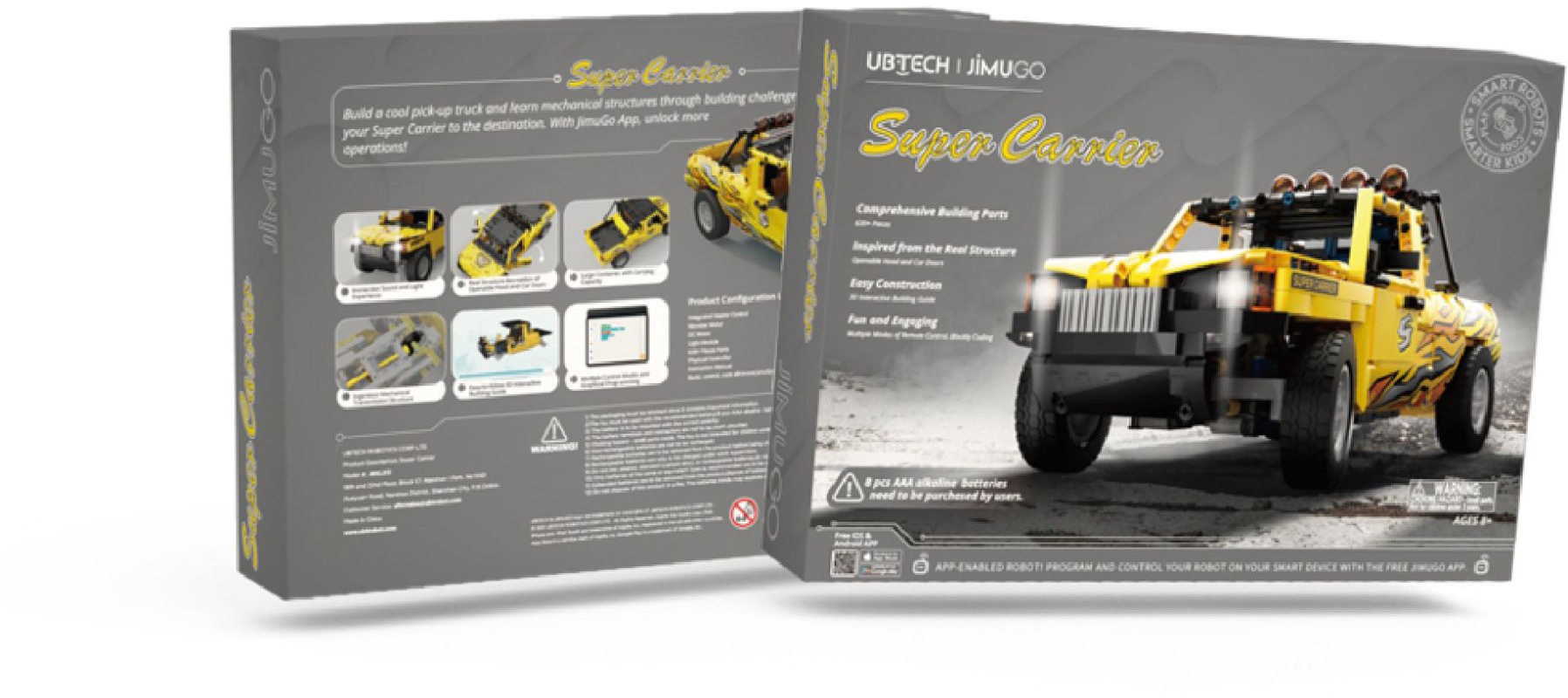 Робот-конструктор UBTech Jimu Supper Carrier Управляемый внедорожник подходит для тех, кто любит путешествия, бездорожье и скорость. Заниматься робототехникой и обучением одновременно ещё никогда не было так весело и интересно Научит азам робототехники Игрушку можно обучать и программировать. Ребёнок сможет погрузиться в изучение робототехники и насладиться игрой. Машиной роботом можно управлять в приложении JimuGO, подключение происходит по Bluetooth. Сделан из качественных материалов С роботом-конструктором UBTech Jimu Super Carrier JRKL213 можно играть всей семьёй или с друзьями. Детали устройства сделаны из качественных безопасных для детей и взрослых материалов. Веселье без остановки Веселье и радость не оставит дом на продолжительный срок. Робот выполнит все команды, не уставая при этом. Когда разрядится машина, стоит её подключить к электрической сети. Через 30 минут можно снова продолжать игру.