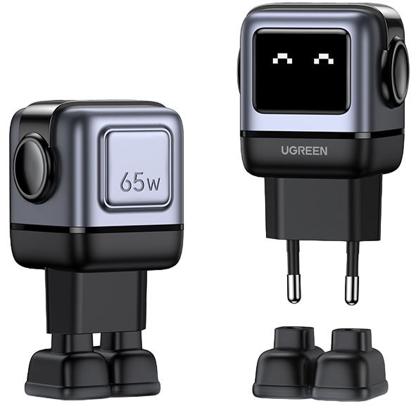 Сетевое зарядное устройство UGREEN Nexode Robot GaN Если вы цените и функциональность, и эстетику своих устройств, вам наверняка понравится настенное зарядное устройство UGREEN Nexode RG. Его уникальный дизайн в виде милого маленького робота порадует вас с первого взгляда. Он имеет три доступных порта, которые позволяют заряжать три устройства одновременно, а мощность до 65 Вт обеспечивает быструю зарядку планшета или телефона без долгих ожиданий. Дополнительно зарядное устройство оснащено небольшим светодиодным дисплеем, на котором отображается информация о его работе, что делает его использование еще более удобным. Заряжайте несколько устройств одновременно Вам нужно заряжать несколько устройств одновременно или поделиться зарядным устройством с другом? Нет проблем – с зарядным устройством UGREEN никому не придется ждать своей очереди. Модель Nexode RG предлагает целых 3 порта — 1x USB-A и 2x USB-C, поэтому к ней можно подключить до 3-х устройств одновременно! Исключительная мощность Зарядное устройство имеет впечатляющую мощность до 65 Вт, что позволяет быстро заряжать ваши устройства. Дополнительным преимуществом является использование технологии GaN, которая не только повышает его эффективность, но и снижает потери энергии и обеспечивает лучший отвод тепла. Все это обеспечивает безопасное использование, делая зарядное устройство надежным инструментом для зарядки электронных устройств. Учитывая мельчайшие детали Благодаря компактному дизайну зарядное устройство может сопровождать вас практически везде, где бы вы ни находились. Вы можете легко поместить его в сумочку или рюкзак, не увеличивая вес вашего багажа. Кроме того, уникальный дизайн в виде милого робота наверняка понравится многим пользователям, придавая ему приятный и дружелюбный вид. Изделие также оснащено съемными магнитными ножками, которые позволяют надежно прикрепить его к выбранным металлическим поверхностям. В то же время эти же ножки защищают вилку от возможных повреждений. Встроенный дисплей Зарядное устройство оснащено встроенным дисплеем, который воспроизводит лицо и мимику робота, предоставляя при этом важную информацию о его рабочем состоянии. Благодаря этому одного взгляда достаточно, чтобы проверить, например, находится ли устройство в режиме быстрой зарядки или режиме постепенной зарядки. Это интуитивно понятное решение упрощает управление процессом зарядки, обеспечивая при этом увлекательную и привлекательную визуализацию. Множество возможностей С зарядным устройством UGREEN Nexode RG вы забудете о проблемах совместимости. Он универсален и позволяет заряжать самые разные устройства, например, смартфоны, планшеты, беспроводные наушники и портативные игровые приставки. Это значит, что вам не придется себя ограничивать – вы сможете заряжать все необходимое с помощью одного устройства.