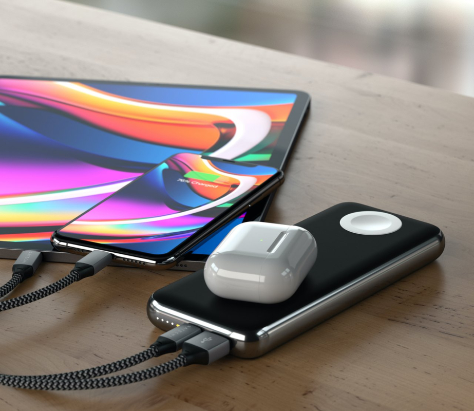 Оцените удобство беспроводной зарядки на ходу с беспроводным аккумулятором Satechi Quatro Wireless Power Bank – 10000 мАч. Satechi Quatro Wireless сочетает в себе портативный аккумулятор и беспроводную зарядку. Вы сможете без дополнительных проводов заряжать свой смартфон с помощью встроенного беспроводного зарядного устройства Qi. Кроме этого Quatro Wireless Power Bank имеет встроенное зарядное устройство для Apple Watch, а также оснащен портом USB-C PD и портом USB-A для одновременной зарядки нескольких устройств. Кабели для зарядки продаются отдельно.
